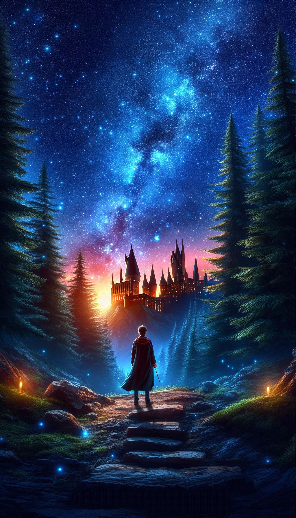 3. Интерьер Хогвартса. Некоторые обои могут изображать Гарри в Большом зале или на лестнице, ведущей к одной из башен. ИИ учитывает детали, такие как парящие свечи, знамёна факультетов и витражные окна, делая сцену не менее атмосферной.
