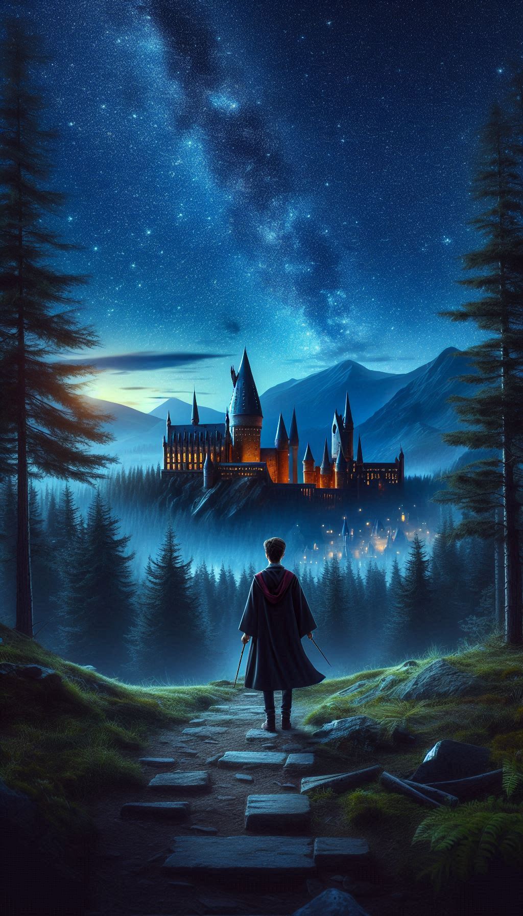 Обои, сгенерированные ИИ: Гарри Поттер на фоне Хогвартса