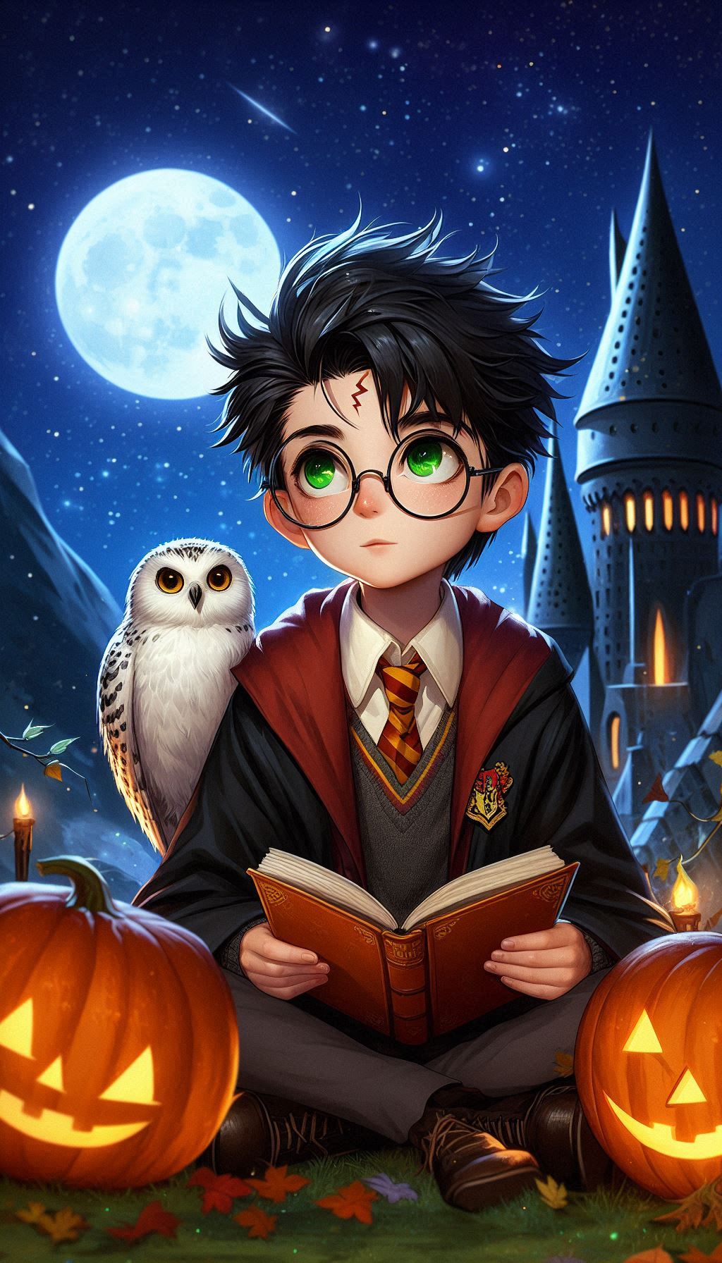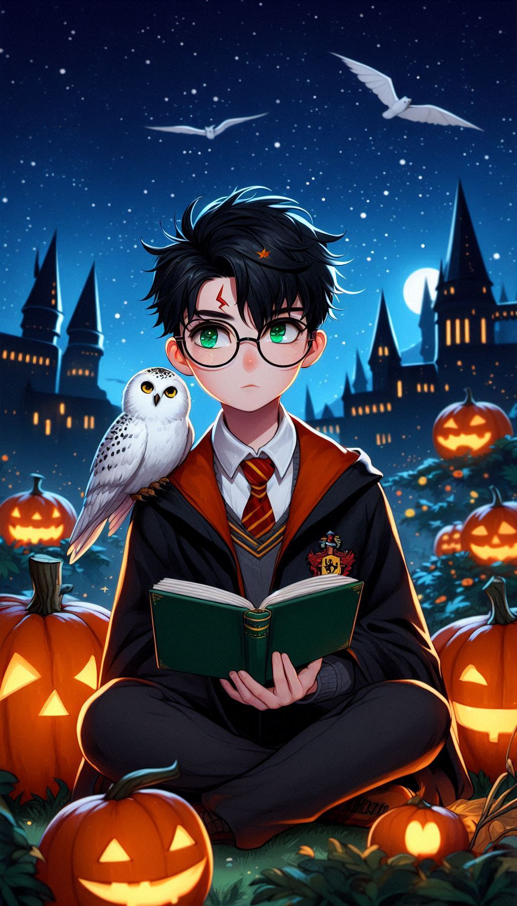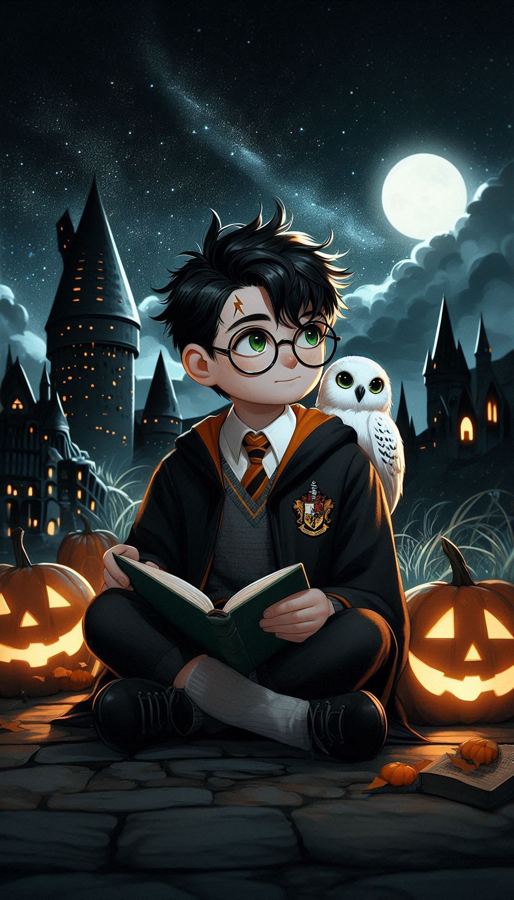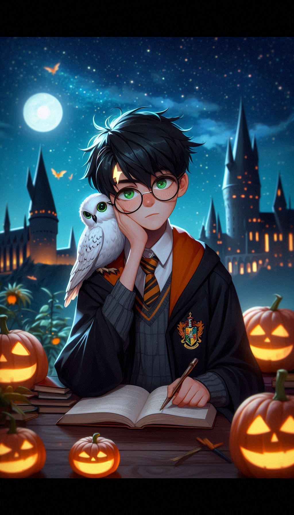 Классическая осенняя сцена в Хогвартсе: Гарри сидит на фоне замка, окружённый яркими оранжевыми тыквами, которые напоминают о празднике Хэллоуин. Рядом с ним его преданная сова Букля. Букля, с характерным белоснежным оперением и умным взглядом, как будто ждет нового письма или послания для передачи. Гарри, в своем фирменном шарфе Гриффиндора и мантии, создаёт тёплую и уютную атмосферу. Эта сцена символизирует привязанность Гарри к дому, уюту и его верных спутников, даже в мире полной опасностей.