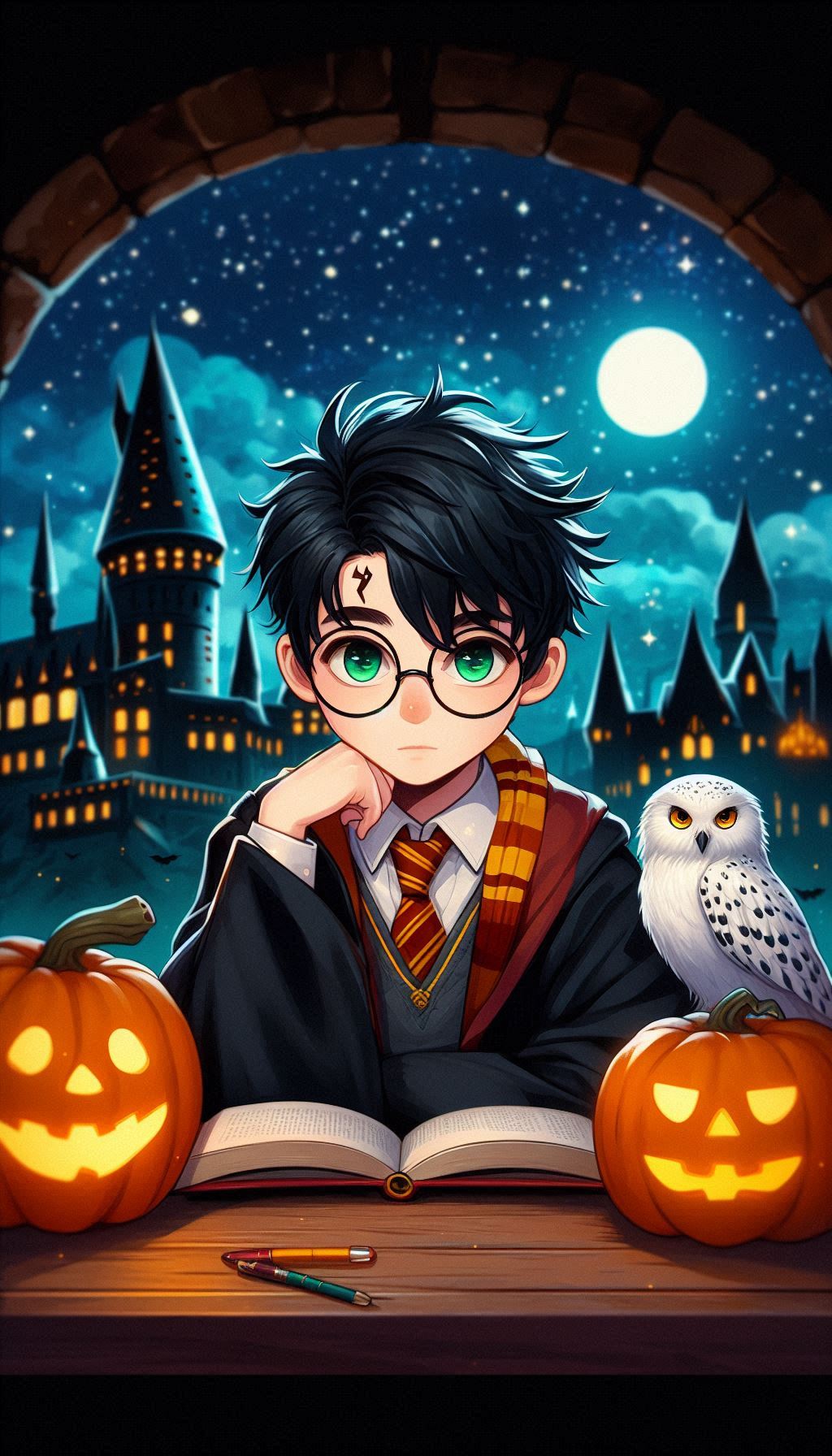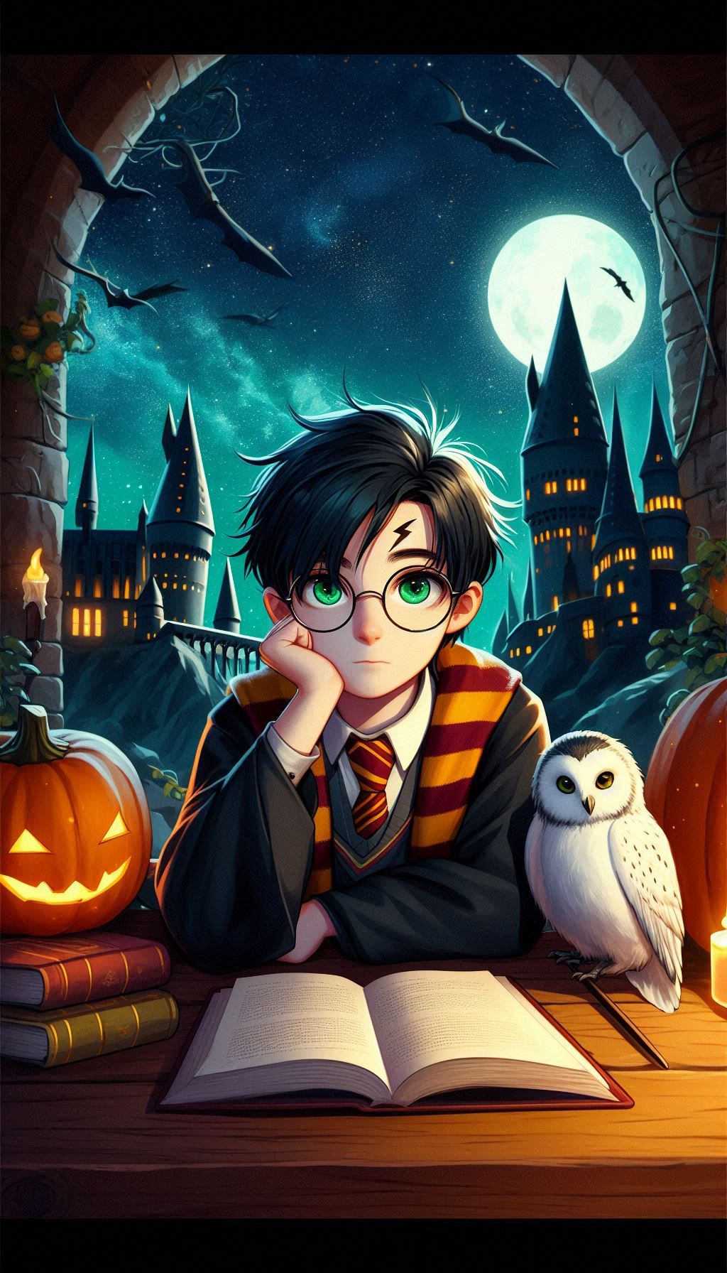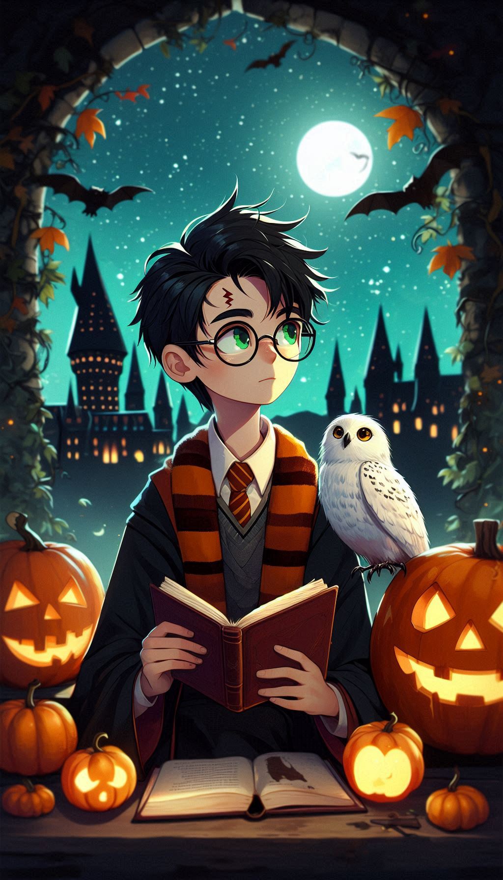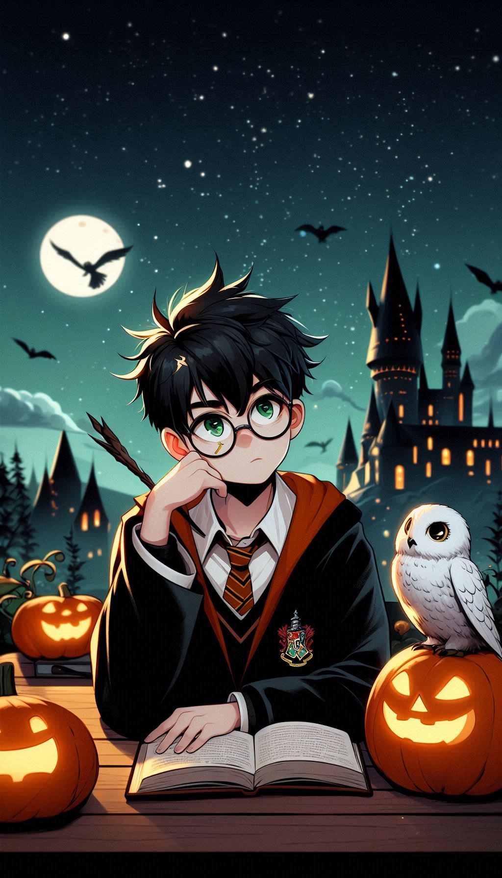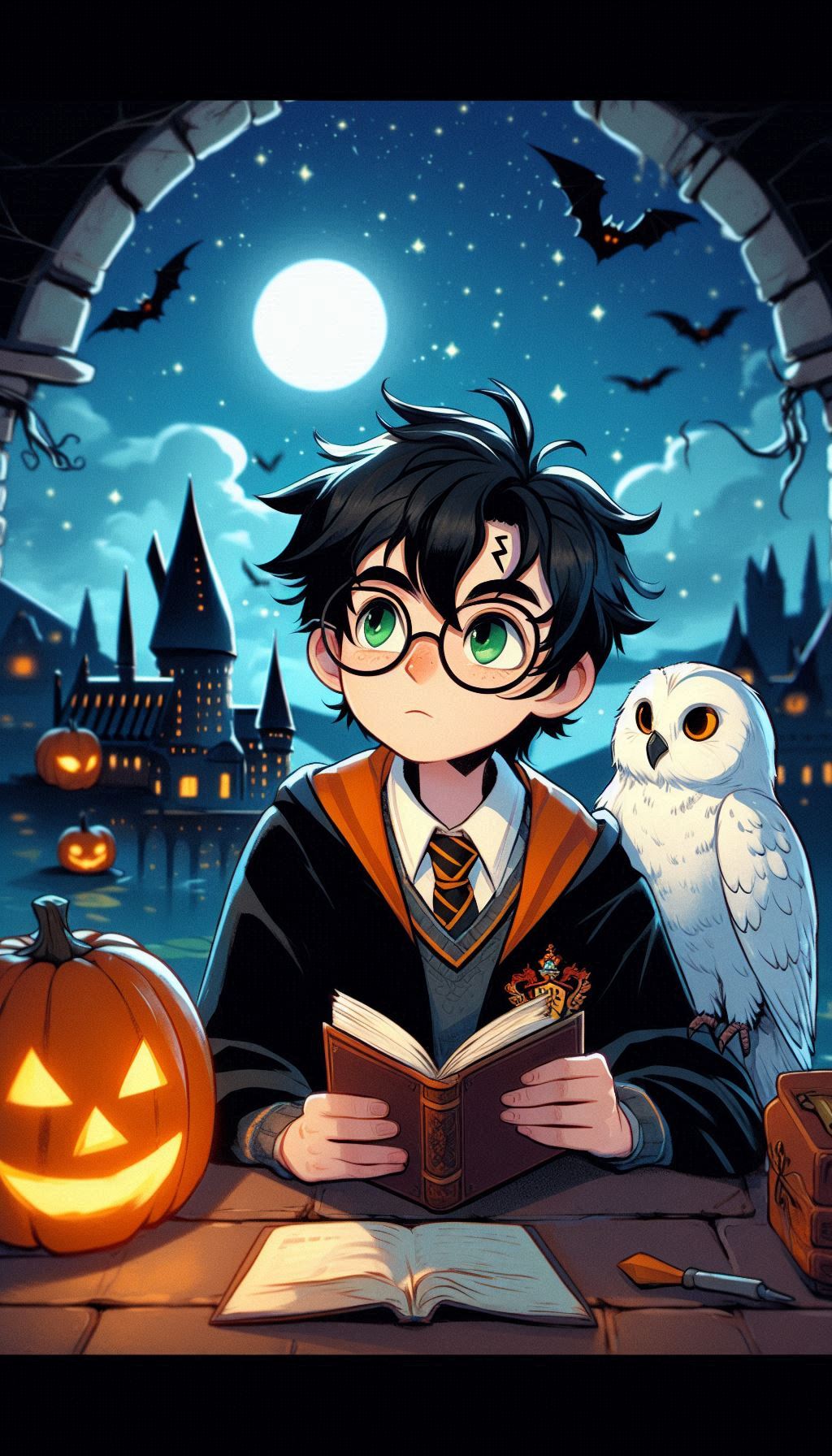 Классическая осенняя сцена в Хогвартсе: Гарри сидит на фоне замка, окружённый яркими оранжевыми тыквами, которые напоминают о празднике Хэллоуин. Рядом с ним его преданная сова Букля. Букля, с характерным белоснежным оперением и умным взглядом, как будто ждет нового письма или послания для передачи. Гарри, в своем фирменном шарфе Гриффиндора и мантии, создаёт тёплую и уютную атмосферу. Эта сцена символизирует привязанность Гарри к дому, уюту и его верных спутников, даже в мире полной опасностей.
