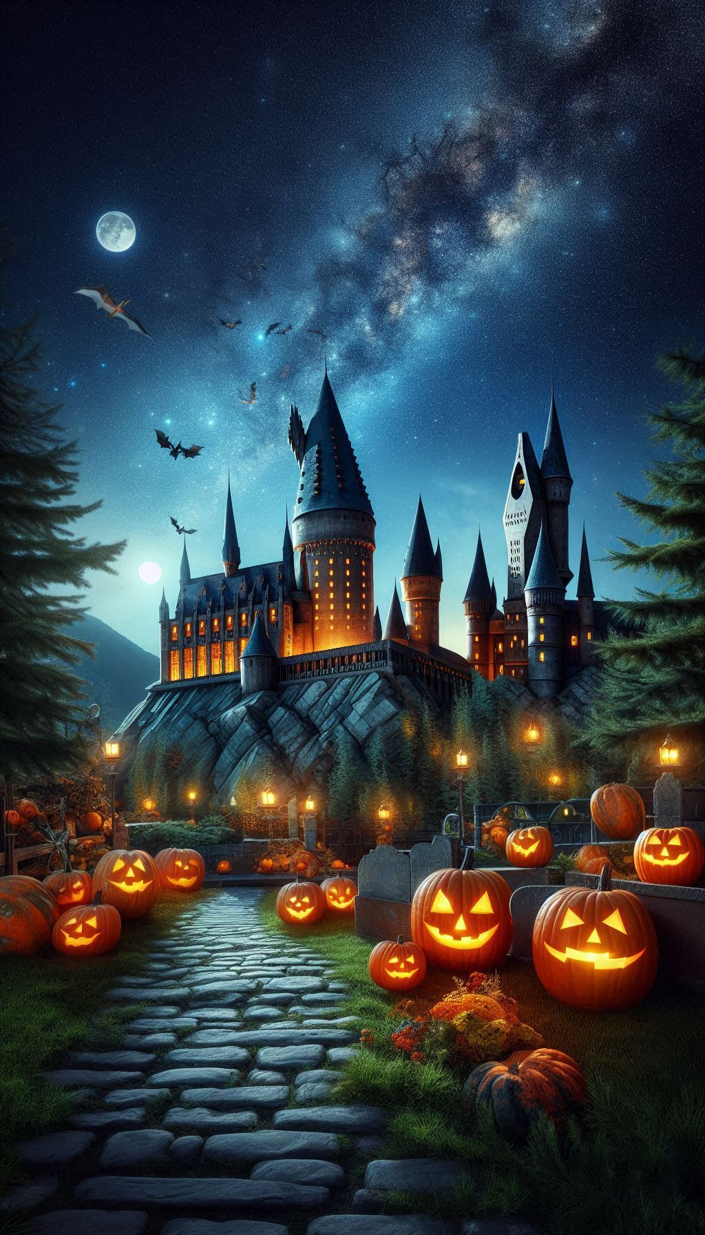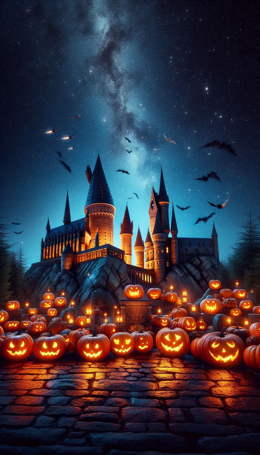 1. Гарри Поттер на фоне Хогвартса с совой Буклей и тыквами 🎃🦉