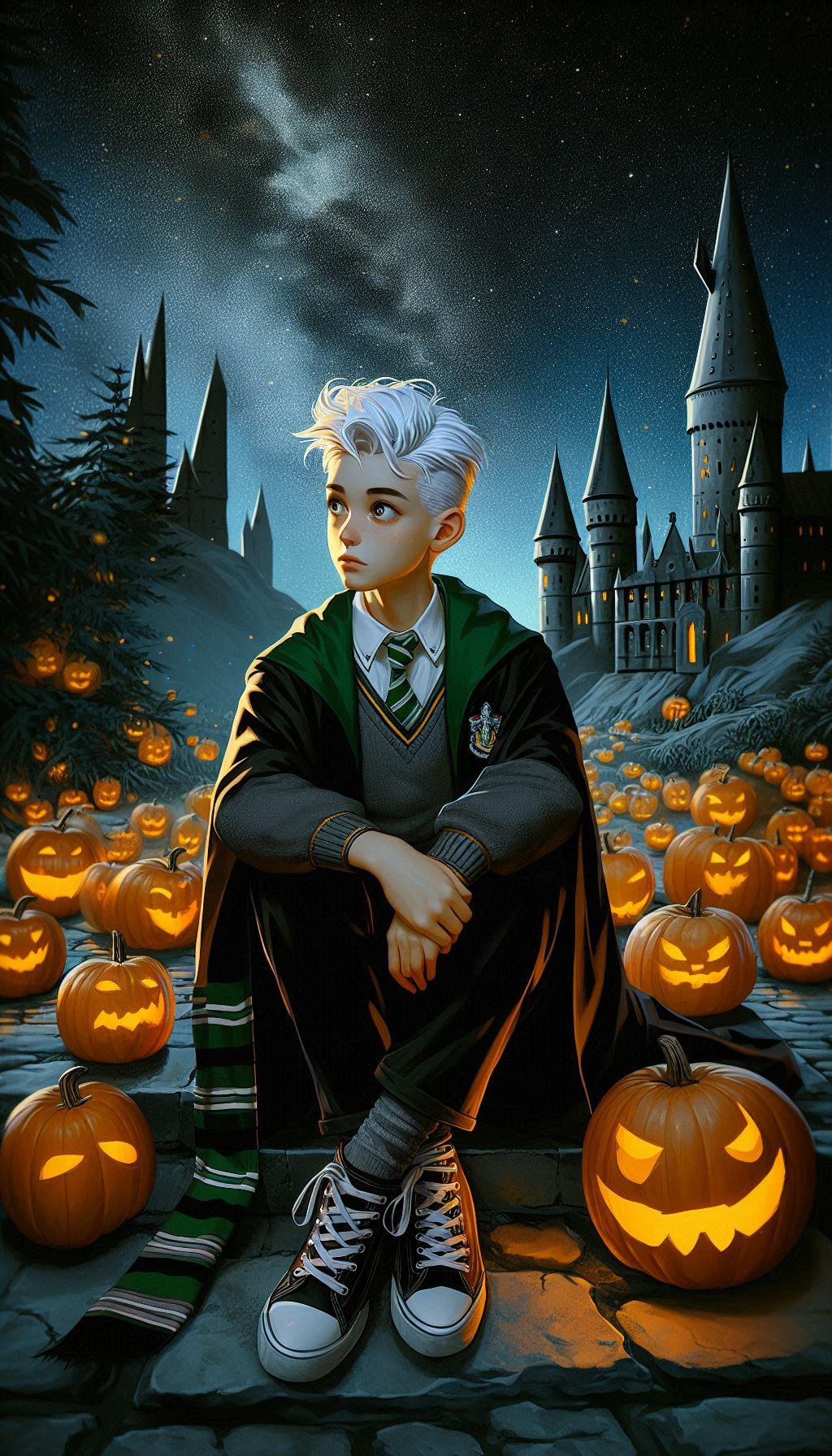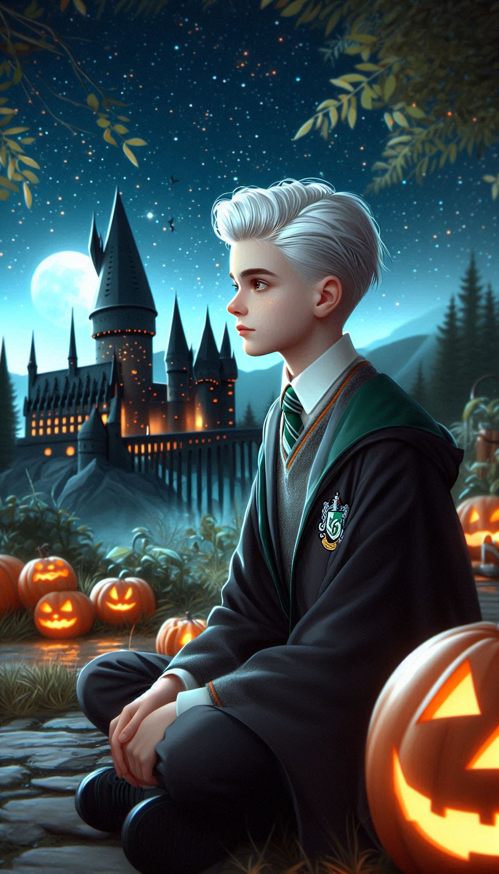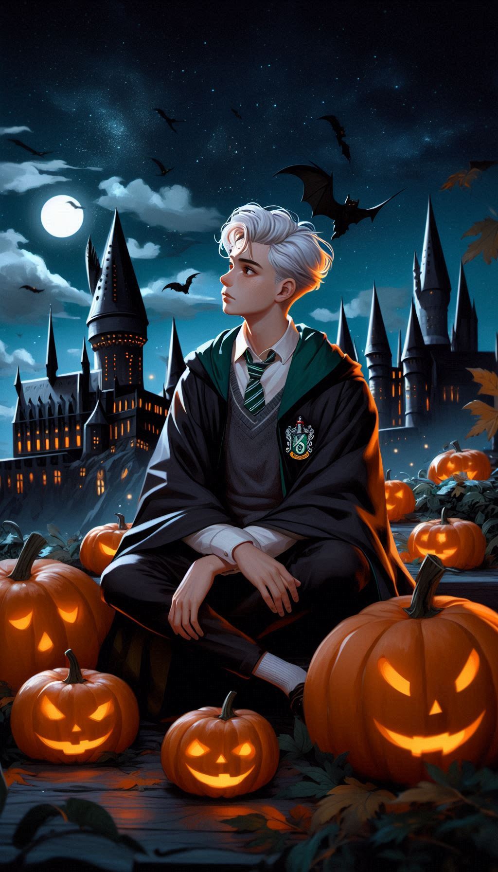 Образ Драко Малфоя на фоне Хогвартса олицетворяет таинственность и загадочность. Осенний Хогвартс, украшенный тыквами и покрытый вечерним сумраком, усиливает этот эффект. Драко сидит, гордо подняв голову, напоминая о своем происхождении и высоком статусе, но окружение смягчает его образ, как бы приглашая его в атмосферу домашнего уюта и праздника.