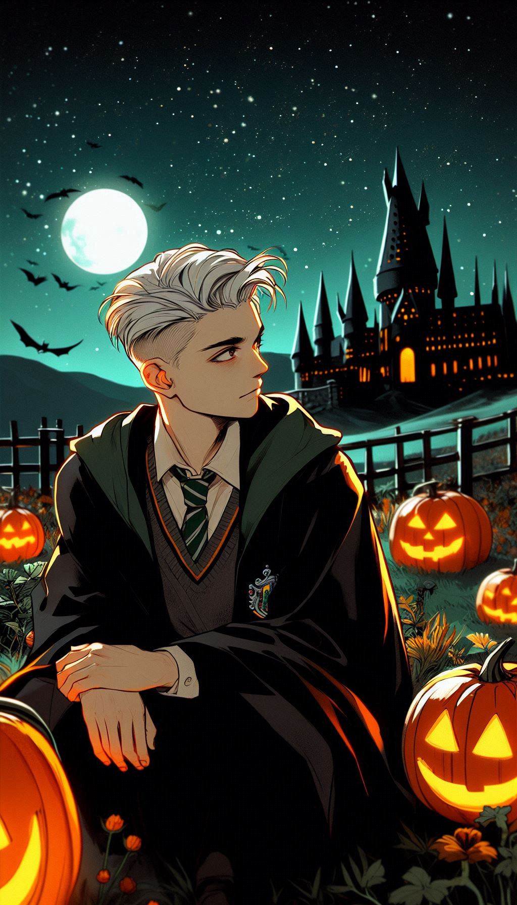4. Драко Малфой на фоне Хогвартса с тыквами 🎃🐍