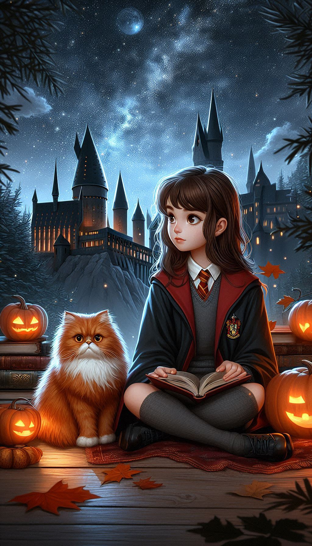 Образ Гермионы, сидящей на фоне величественных башен Хогвартса, создаёт гармонию ума, магии и независимости. Рядом с ней уютно устроился ее кот Живоглот, обладатель ярко-рыжей шерсти и не менее яркого характера. На заднем плане можно увидеть теплое освещение замка, а у её ног — разбросанные тыквы, создающие осенний антураж. Эта сцена передаёт момент её уединения, когда она погружена в свои размышления, но при этом рядом всегда её пушистый друг.