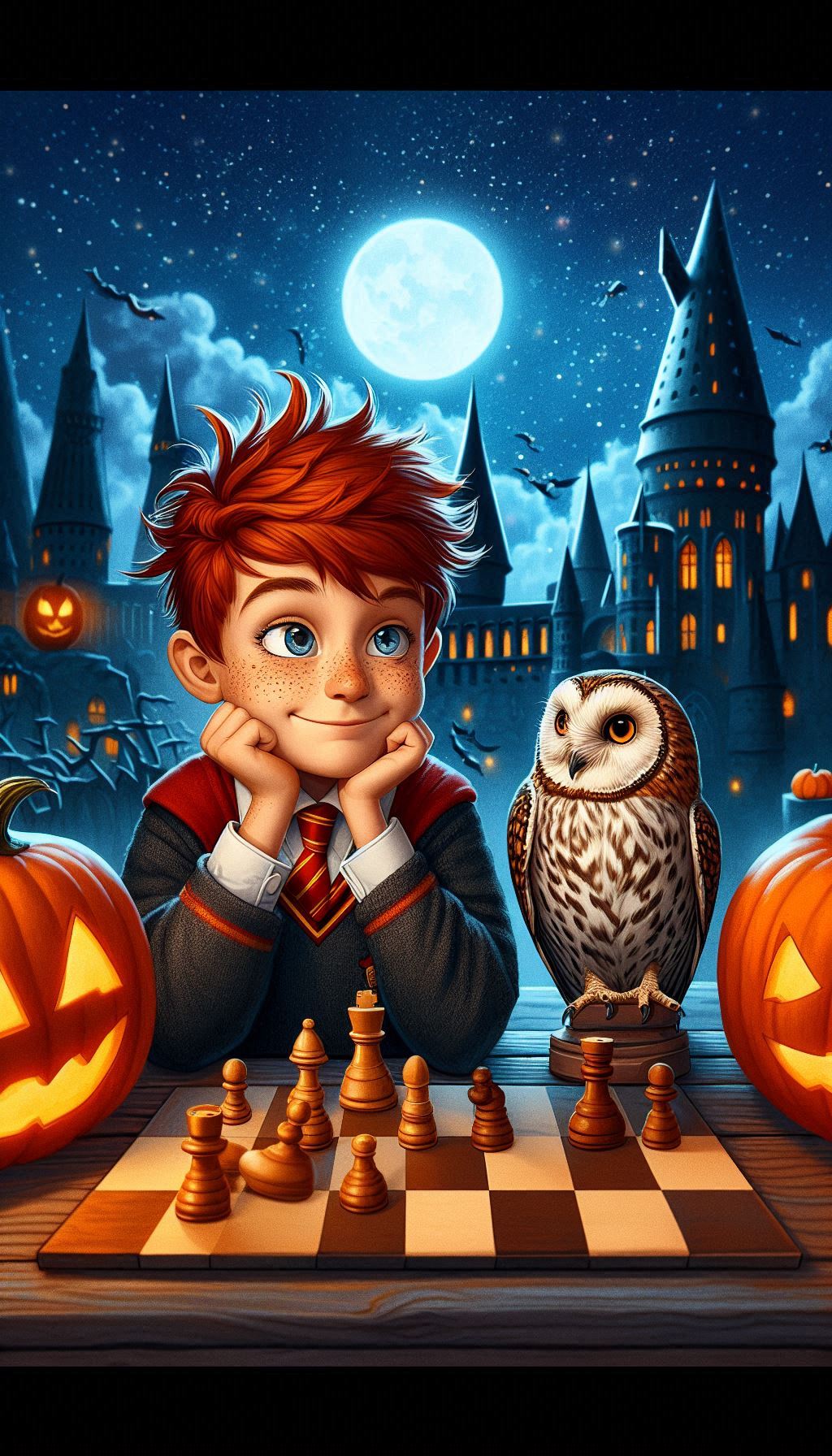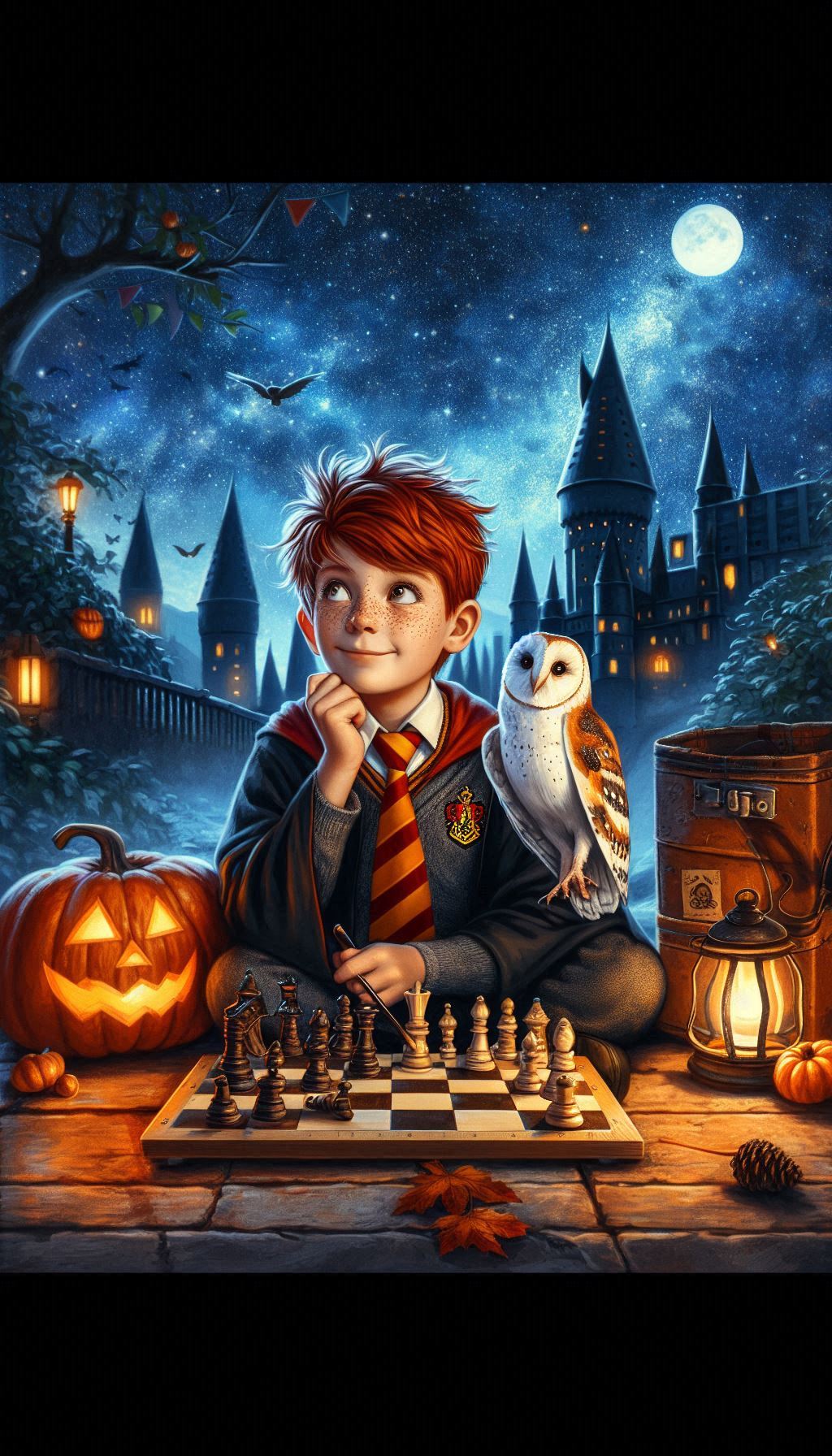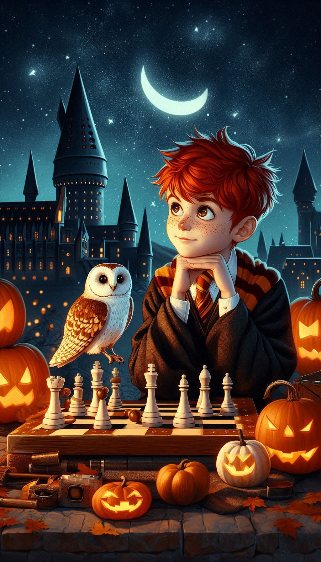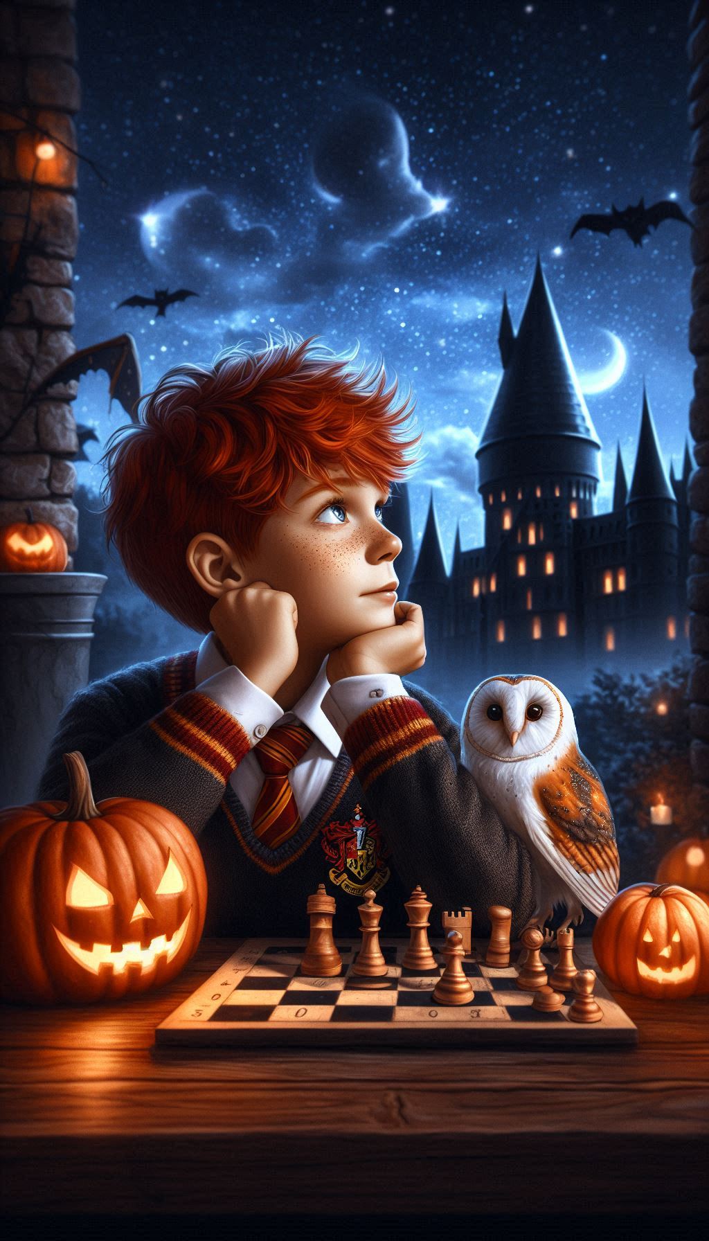 3. Рон Уизли с совой Сычик и шахматами на фоне Хогвартса ♟️🦉